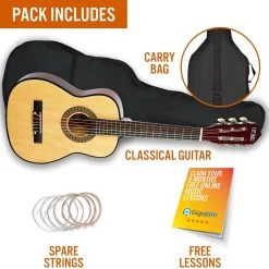 The pack includes some important accessories which are ideal for learning the guitar. A gigbag is included which features a comfortable back strap, making this ideal for carrying to and from lessons or for storage when the guitar isn’t in use. A spare set of guitar strings is also included which is perfect just in case of any accidental breakages.