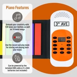 Designed with young musicians in mind, this 49 note keyboard is the perfect instrument to inspire creativity, foster a love for music and provide endless hours of entertainment. The colourful soft-touch keys make it easy to play, quick to learn and fun! The roll-up design is incredibly portable and means it can be conveniently stored and transported as well as making it more durable, ideal for kids.