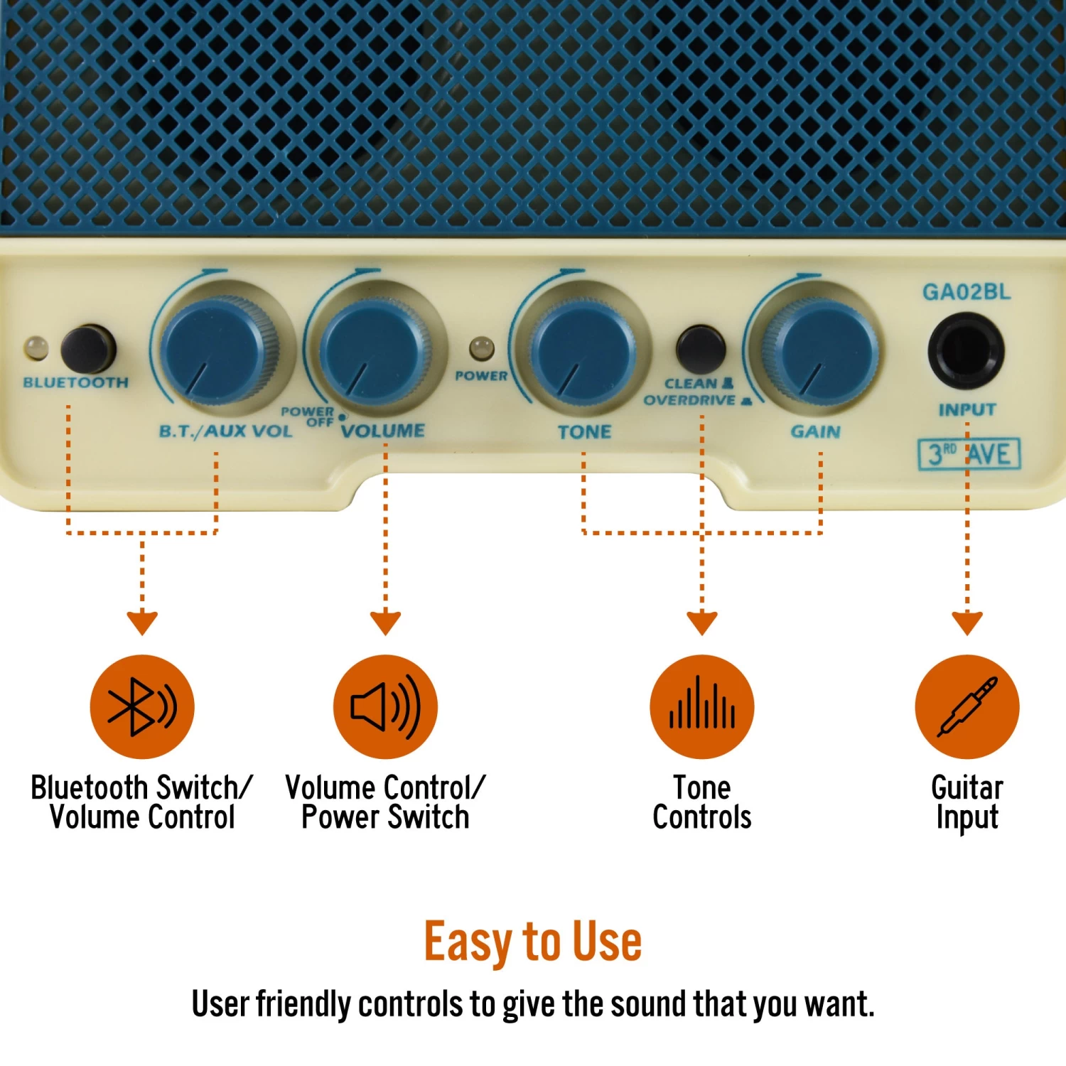 Elevate your jam sessions and practice routines with the 3rd Avenue GA02BL 5W Mini Guitar Amplifier. Designed to deliver a powerful sound experience, this compact amplifier is perfect for musicians on the go. With its unique gunmetal blue and cream colour scheme, it not only sounds great but looks the part too. The added Bluetooth connectivity allows you to stream backing tracks or your favourite songs directly from your device, making it a versatile addition to your musical setup.
