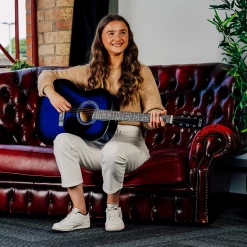 The guitar provided within this package is a standard acoustic guitar, featuring a dreadnought shape and steel strings. A combination which ensures great tone and projection. This particular guitar is supplied in a very attractive blueburst finish, with a transparent blue stain moving to black-burst edges. Which is sure to catch the eye and provide a modern appearance to your guitar.