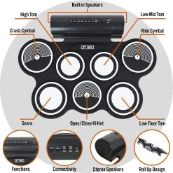 Crash cymbal, ride cymbal, open/close hi-hat, snare, high tom, low tom and floor tom, plus two hi-hat and bass drum pedals. The silicone rubber pads allow the drum sticks to easily bounce back, absorbing the shock and strain on the wrists and letting you continuously hit harder and faster.