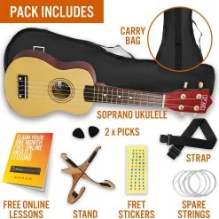 Equipped with a carry bag so you can take your uke everywhere you go, whether that be school, lessons, a friend’s house or even on holiday! In this great value bundle, you also receive a spare set of nylon strings, wooden stand, picks, strap and fret note stickers.