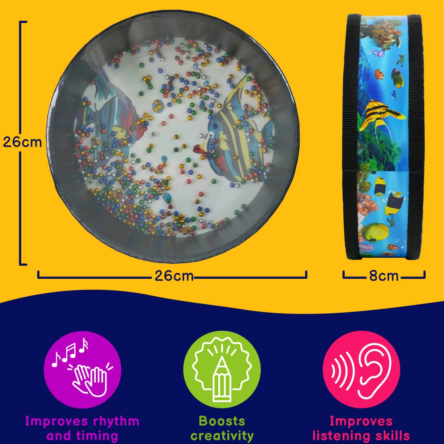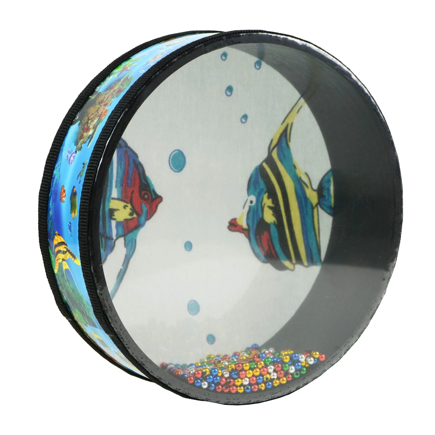 The drum is constructed with a robust, clear synthetic head on one side and a textured canvas on the other, allowing players to view the beads as they create the ocean effect, enhancing the sensory experience. Its sturdy build ensures durability while maintaining excellent sound quality.