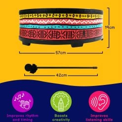 The drum is adorned with a vibrant, eye-catching pattern that captivates and draws in young learners, making it a fun and exciting addition to any music session. Its size ensures that it produces a deep, resonant sound that can fill a classroom, providing a satisfying auditory feedback to budding musicians.