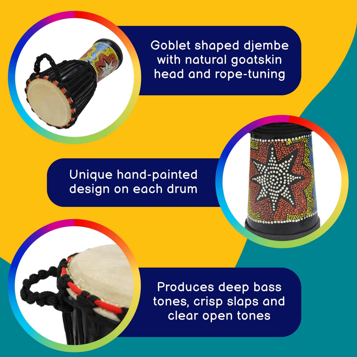 These beautiful A-Star Djembes are traditionally hand made using high quality solid wood and feature natural goatskin heads and rope tuning. They are individually decorated with colourful patterned beading in African inspired designs, and so each is unique.