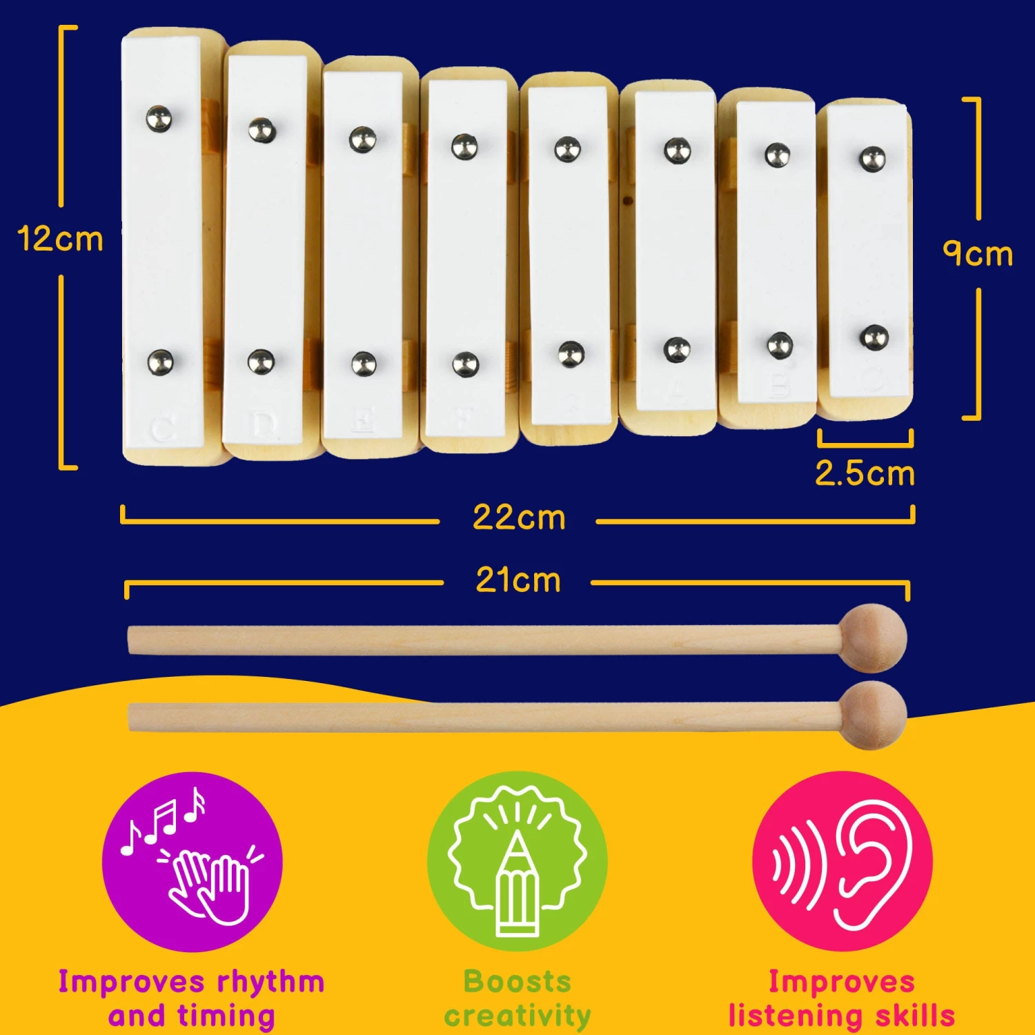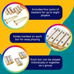 This Chime Bar Set includes 8 separate chime bars, made from a solid wooden base and white, pristine chimes. They create a bright tone and are great for use in the classroom to encourage learning. Labelled with the individual notes, this chime bar set is perfect for any student learning about scales and the basics of music. They can be used in a pack to create a diatonic scale, or separately in group activities. Supplied with eight wooden beaters, these chimes bars are a great addition to the classroom.