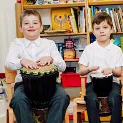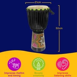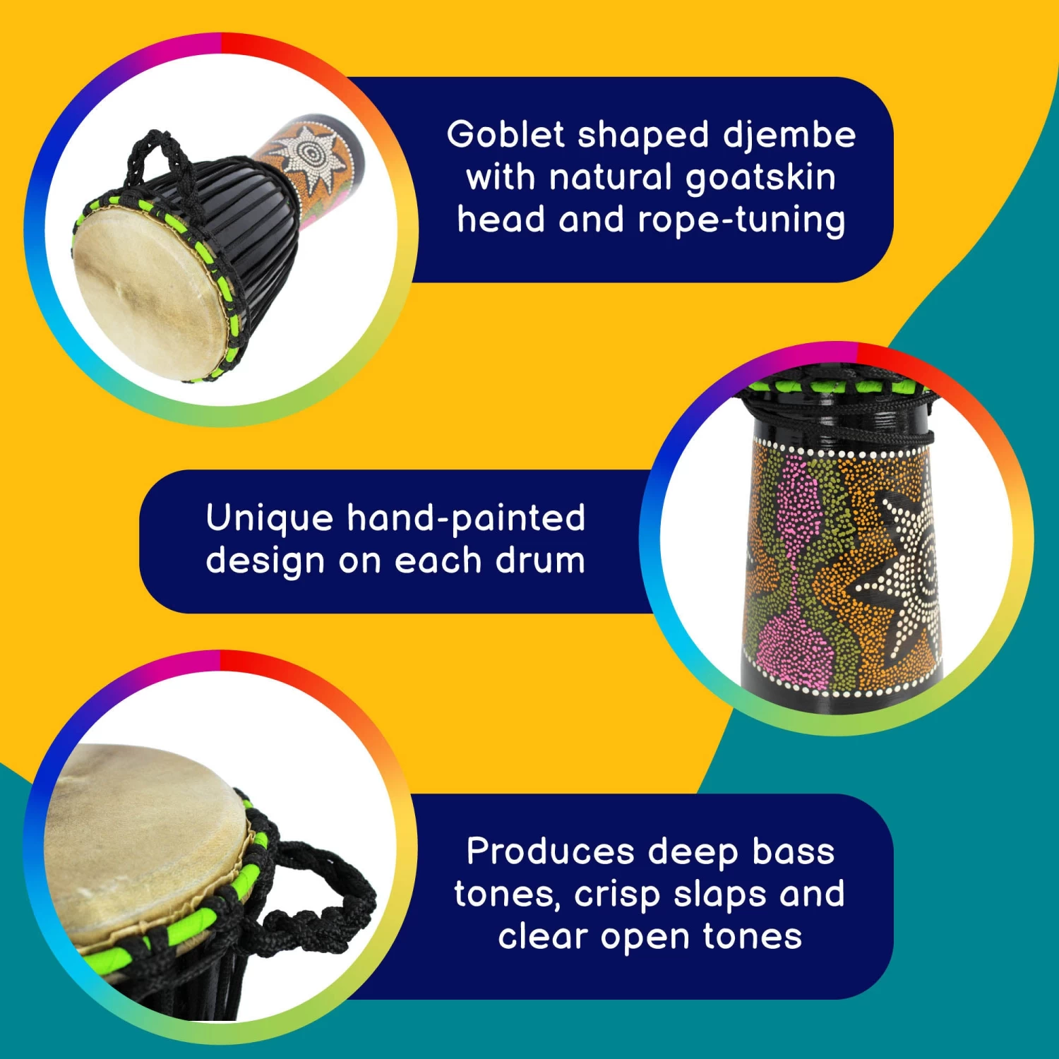 These beautiful A-Star Djembes are traditionally hand made using high quality solid wood and feature natural goatskin heads and rope tuning. They are individually decorated with colourful patterned beading in African inspired designs, so each is unique.