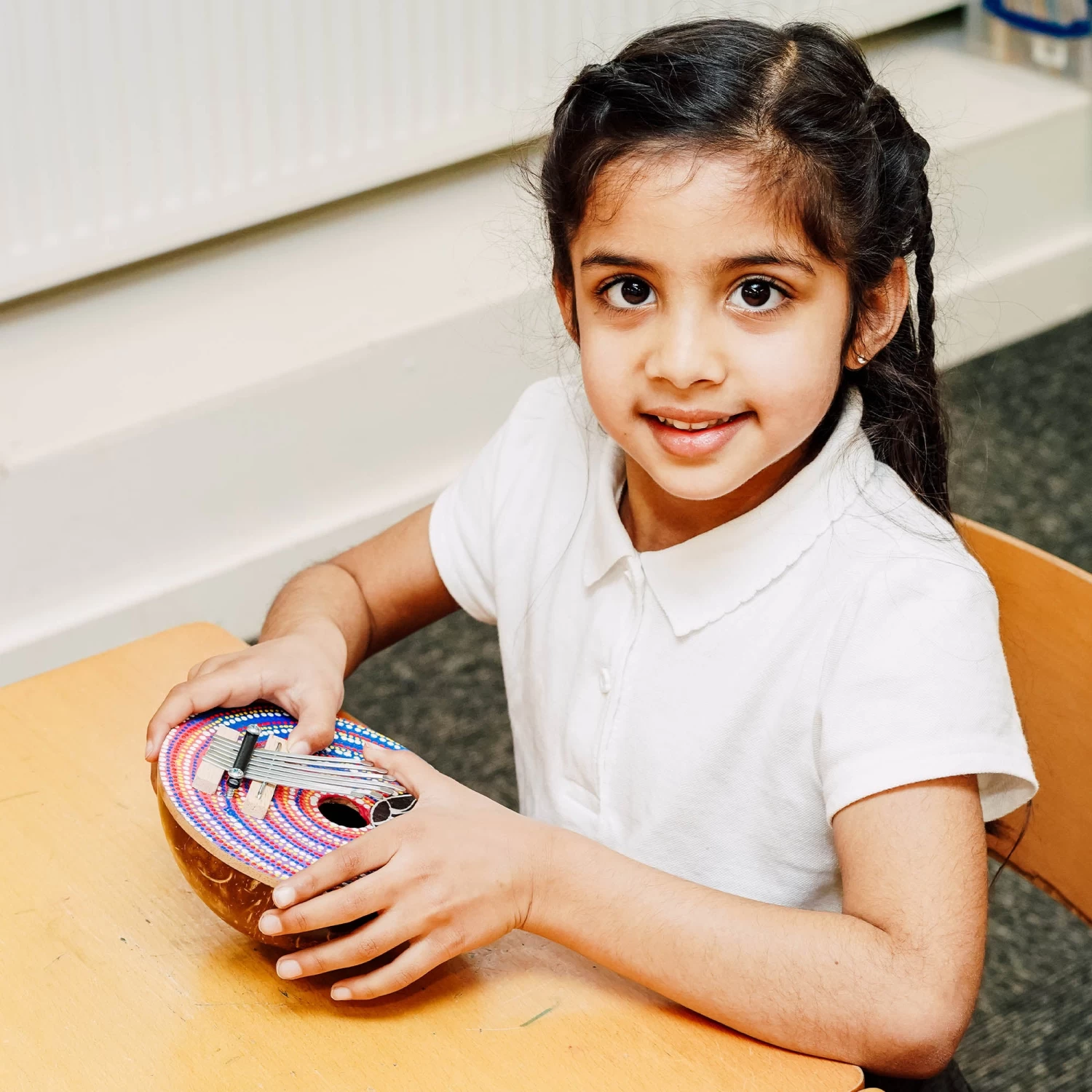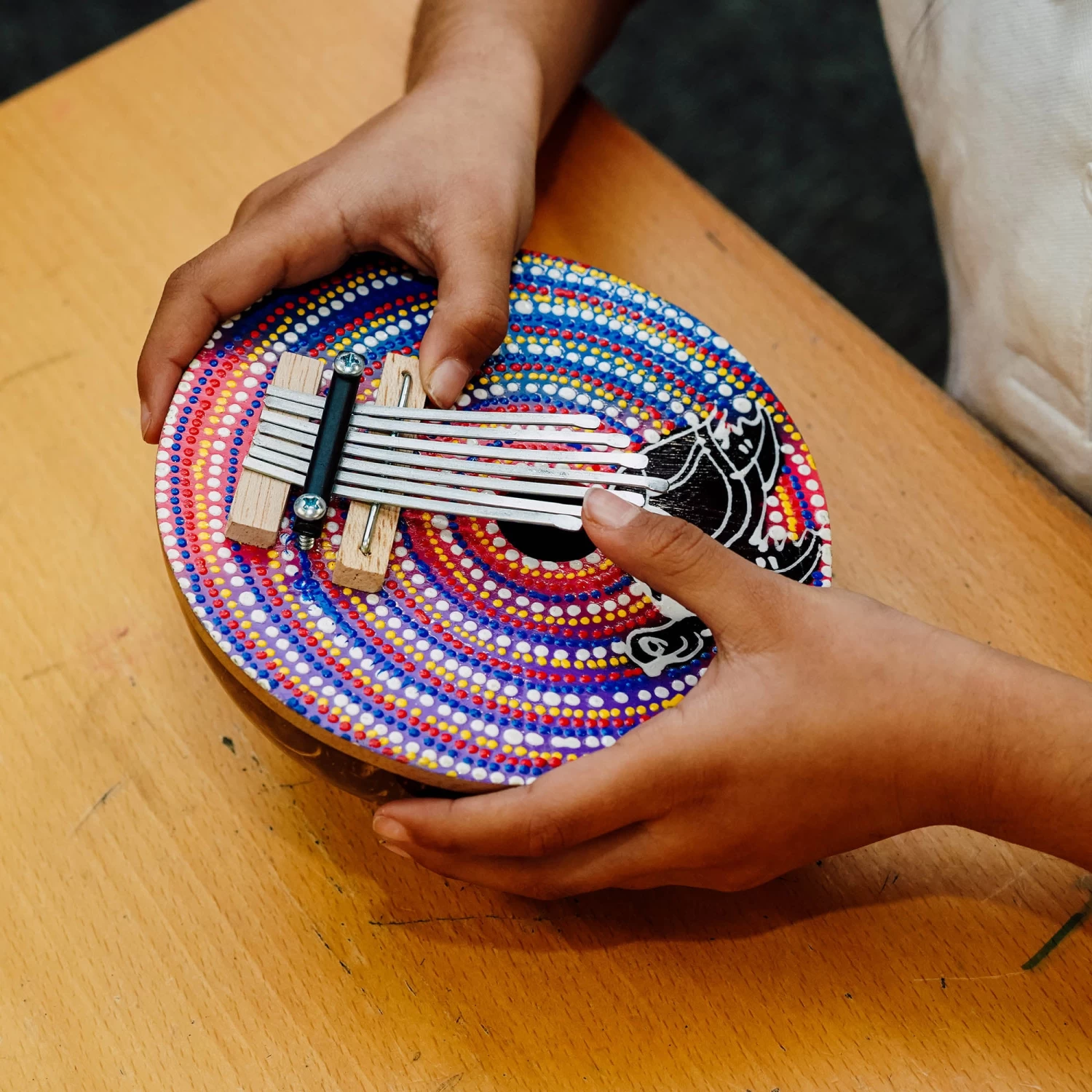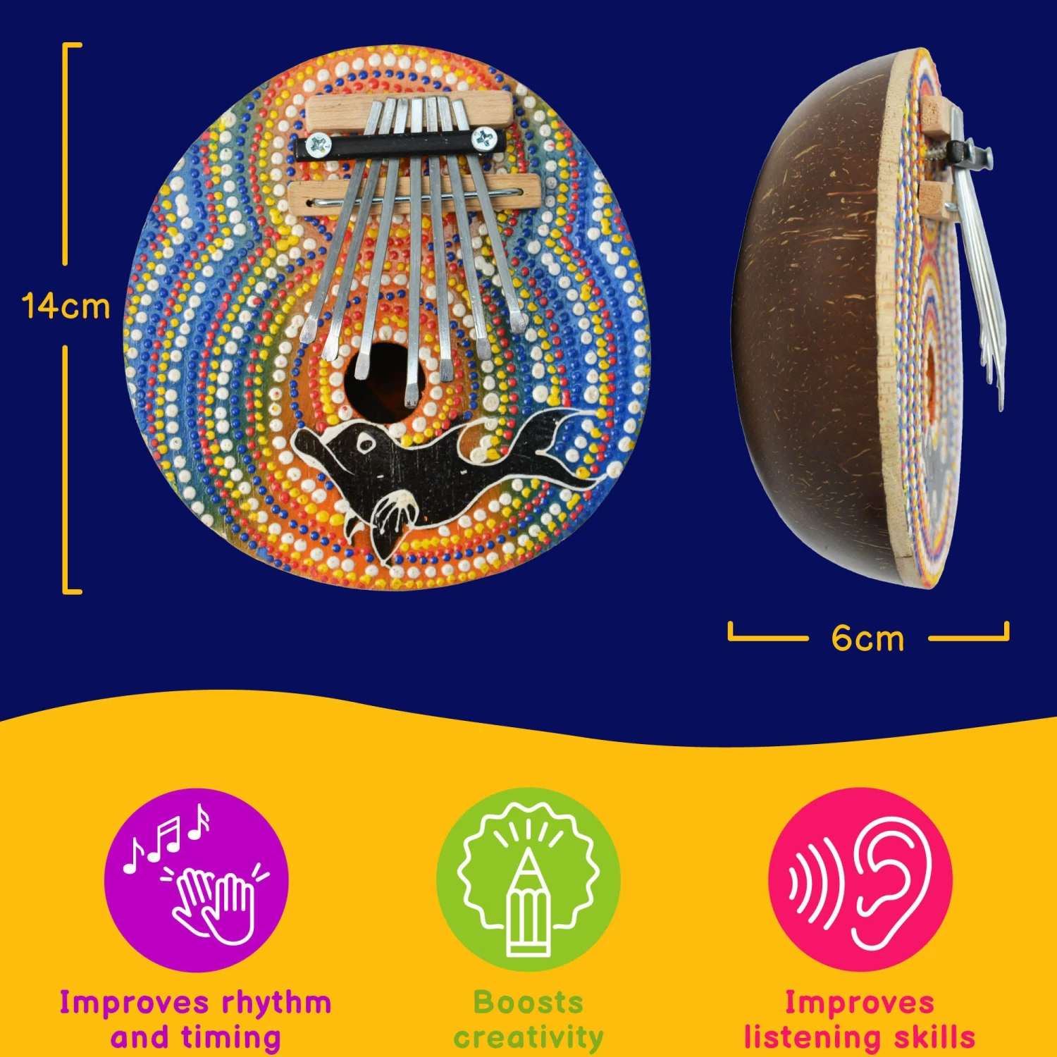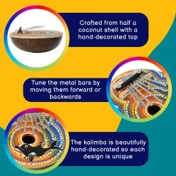 The traditional intricate designs are based on centuries-old art styles and will enhance any percussive group. Played using your thumbs in a downward brushing motion, the metal notes resonate around the coconut shell for a unique and beautiful sound.