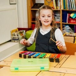 Each chime bar is colour coded and has its note value embossed on top of the bar to aid learning and development of performance skills. They are accurately tuned and produce a delightfully crisp and clear timbre when struck with the beaters. This set comes complete with 2 plastic beaters and is supplied in a strong carry case with a handle. It is lightweight and easy to transport as well as compact to store. These are perfect for educational use both in the classroom and at home, and are amazing fun!