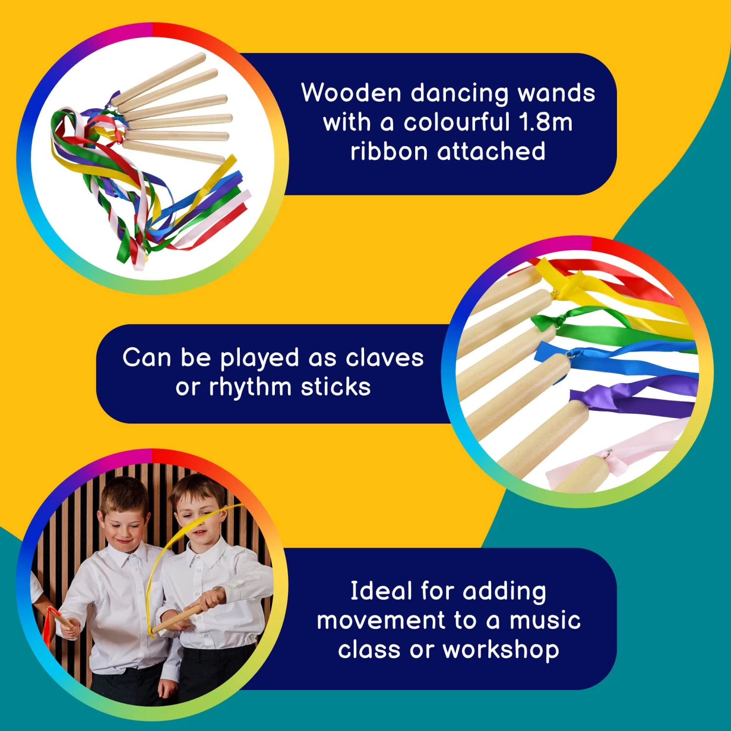 A pack of 6 rainbow wands in assorted colours ideal for dance and movement activities. A fun and physical piece of apparatus for kinesthetic learning.