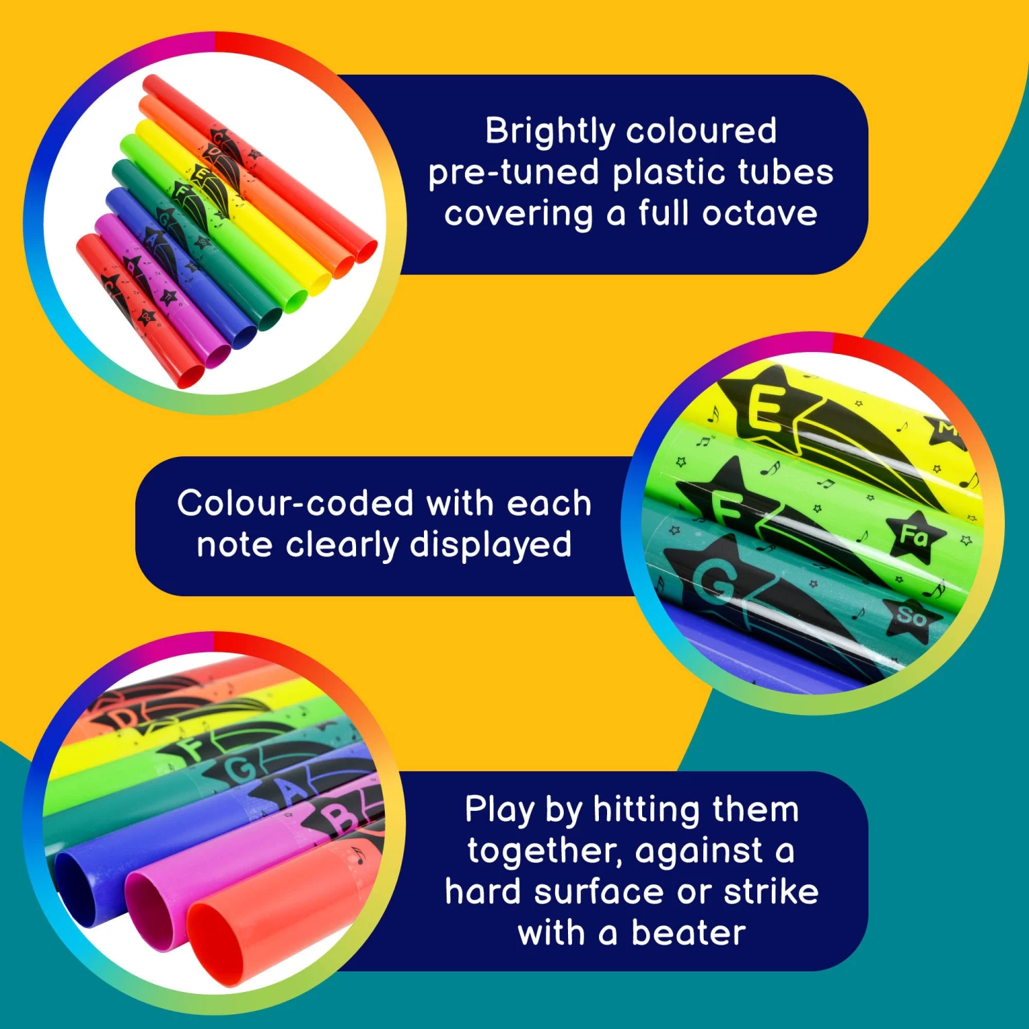 The A-Star Sound Tubes are vibrant, tuned percussion tubes that resonate when struck against any hard, flat surface. Extremely fun and simple to use, the Sound Tubes are perfect for playing melodies and creating musical games. Group play with the tubes is an excellent way to foster teamwork and learn ensemble skills while having a great time, making them a favourite in educational settings.