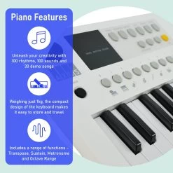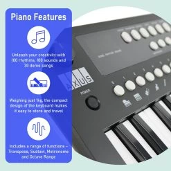 The keyboard offers a range of sounds and rhythms, allowing players to explore various musical styles. Additionally, it includes built-in speakers and a headphone jack for silent practice, making it versatile for any environment. The keyboard can be powered by a USB-C cable or 4 x AA batteries.