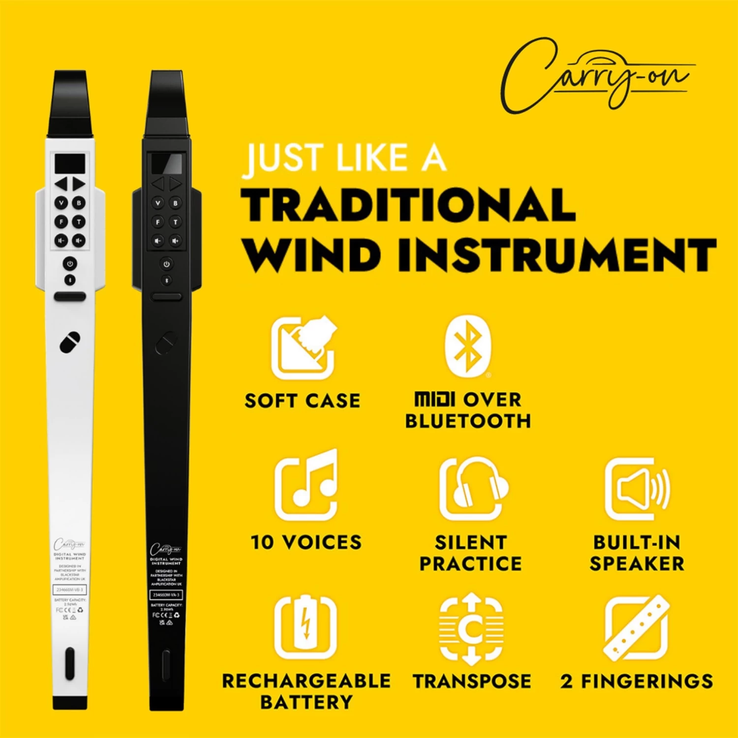 The Carry-on Digital Wind Instrument is a practical solution for silent practice and access to a world of different sound possibilities for players of all types of wind instrument. It features 10 voices which can be heard via the instrument’s built-in speaker or headphones.