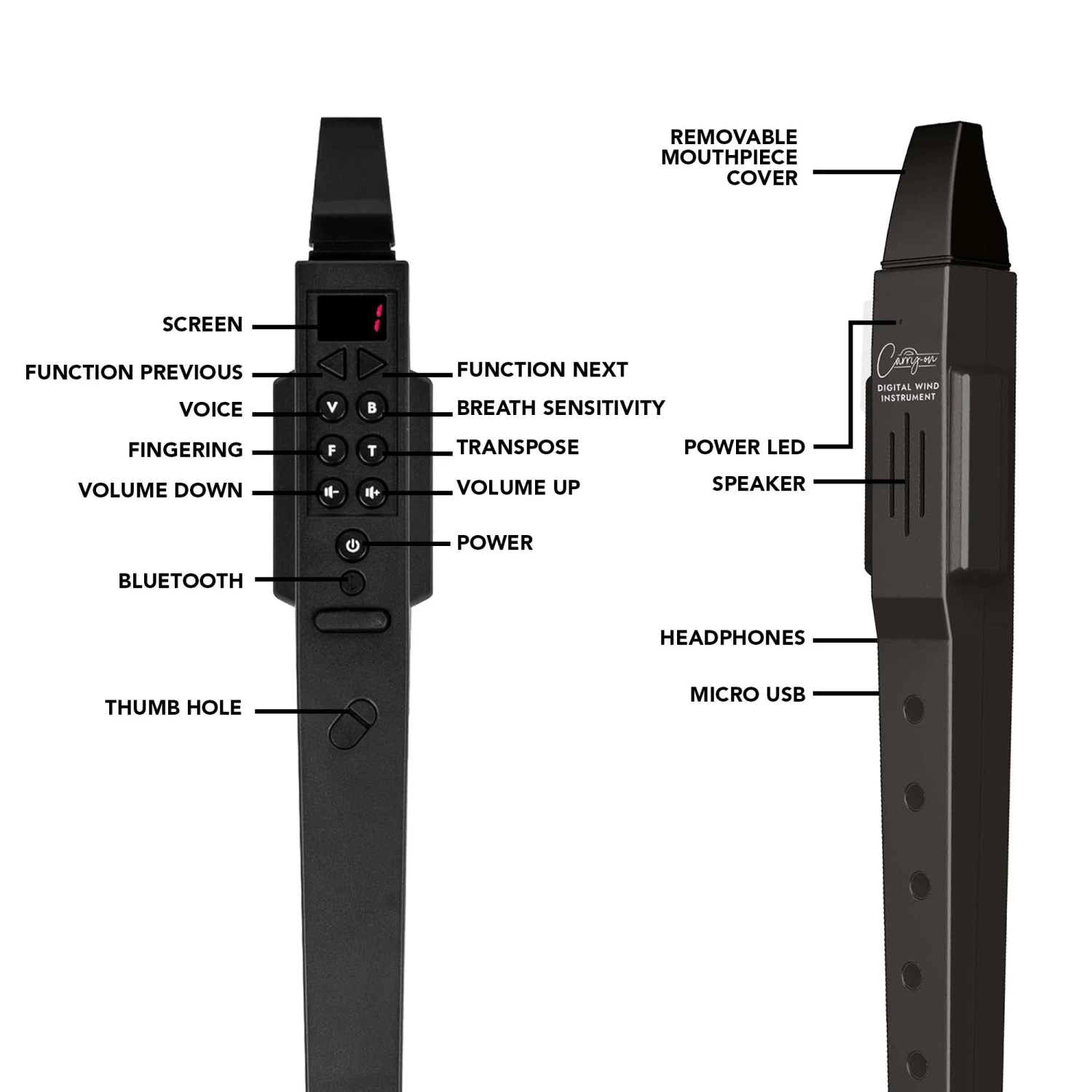 The Carry-on Digital Wind Instrument comes with a soft carry case for easy transportation, and a USB cable for the internal rechargeable battery.