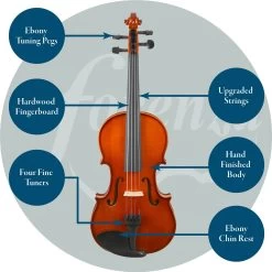 Key features of the Forenza Prima I Series include a robust hardwood fingerboard that withstands frequent practice sessions while providing a smooth playing experience. The violin is fitted with high-quality ebony pegs and a matching ebony chin rest, offering both aesthetic appeal and functional stability. This ensures easy tuning and comfortable playing, essential for developing proper technique.