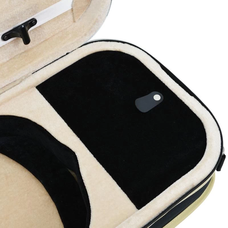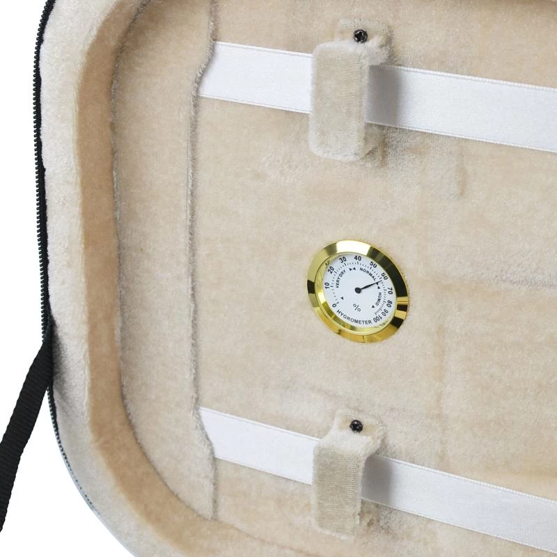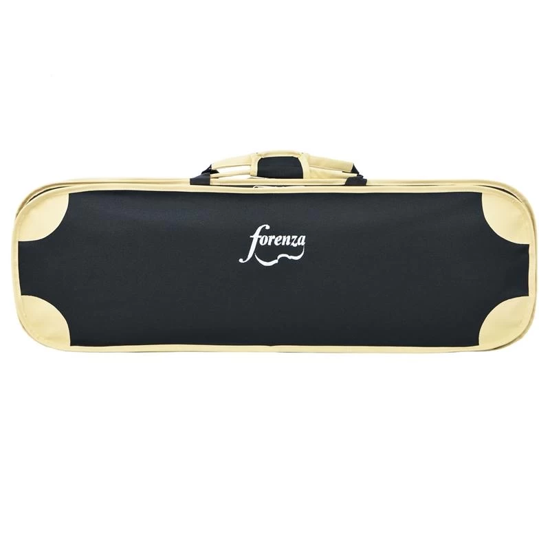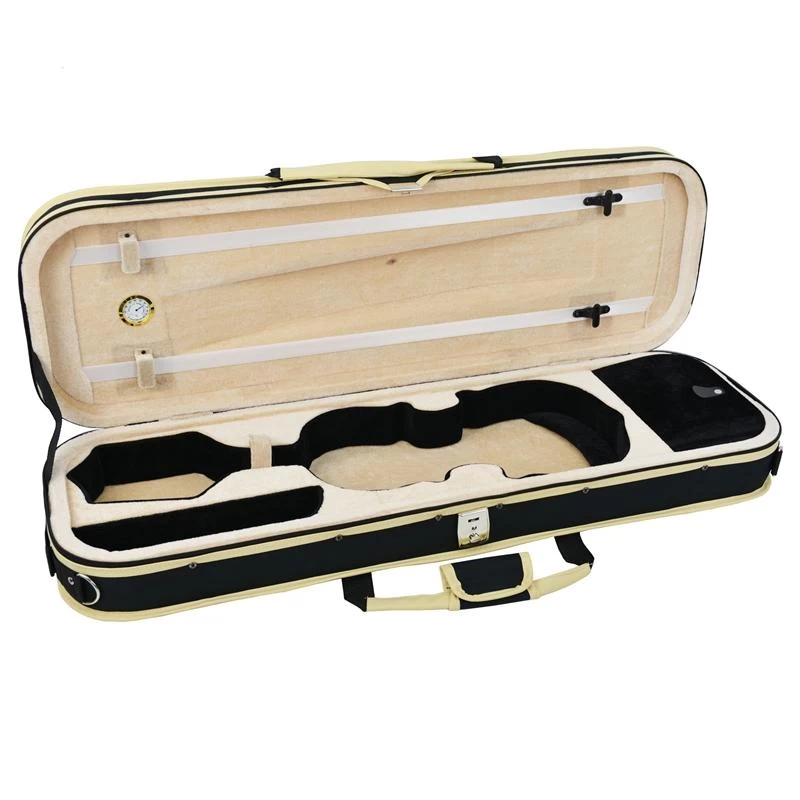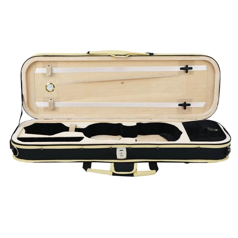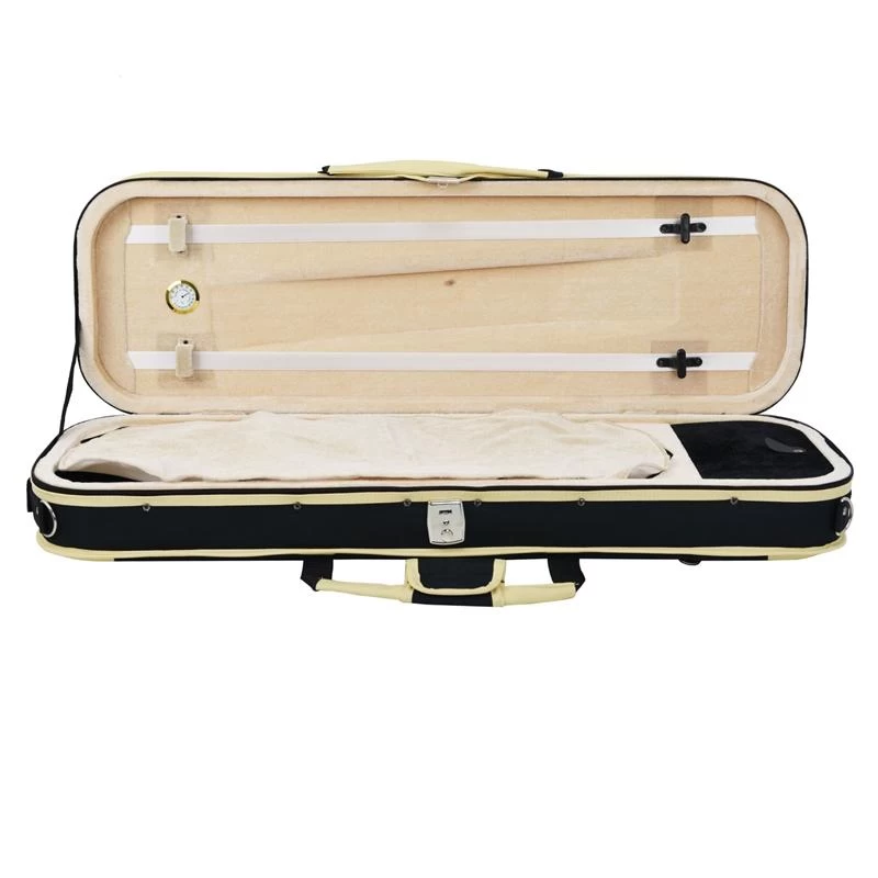 This deluxe oblong violin case provides excellent protection for precious instruments with a firm shaped interior lined with plush velour and a sturdy squared exterior. There are two separate internal compartments for accessories and an external pocket for music. Inside there is space for two bows. Carry with either the handle or shoulder strap.