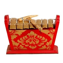 The three sizes of metallophone (each of which is decorated in traditional red, blue and gold with metal keys suspended from wires over individual sound chambers), give a range of 3 octaves and these and all Gamelan instruments are made in Bali, Indonesia.