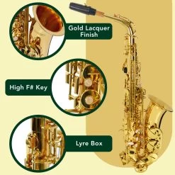 Featuring quality keys, pads and construction, this saxophone is free blowing and has an easy, responsive tone, making it a great option for beginners. Featuring a high F# key, this enables a greater range and is often specified as a requirement by teachers. With gold lacquer on its body and keys, this makes for a lovely looking sax.