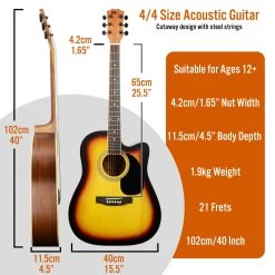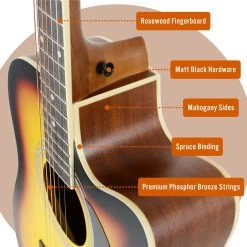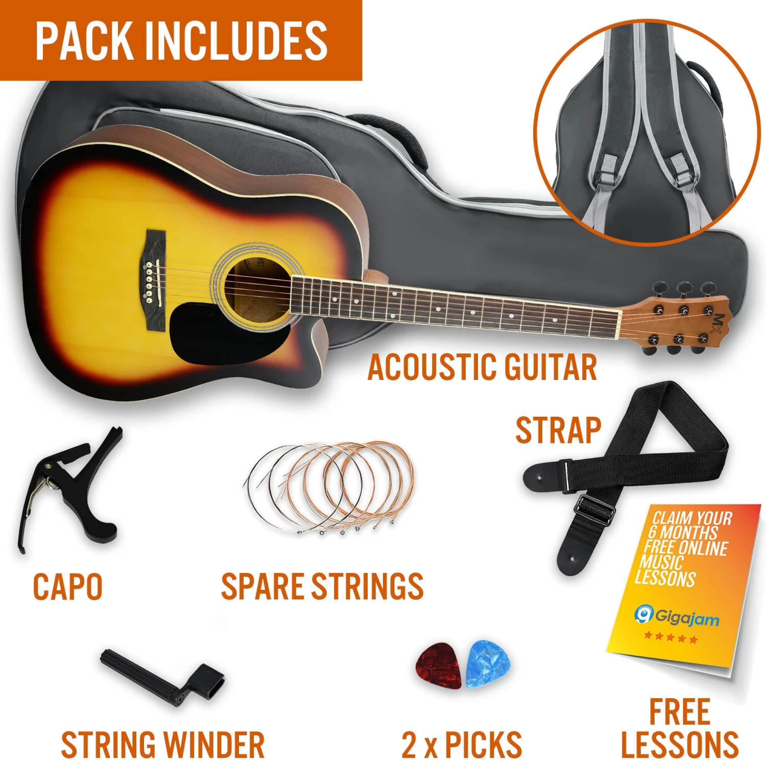Constructed from mahogany with a spruce top, finished in a classic sunburst or natural wood design the MX202 guitar both sounds and looks good. The acoustic prowess is what sets this guitar apart, the warm tones you would expect from a larger body guitar and the increased volume that enables you to be heard without any need for an amp. The contemporary soundhole design coupled with the minimalist black pickguard compliments the rest of the dreadnought body. In addition, the cutaway design enables you to reach the higher frets without any restriction, allowing you to discover the full range of tonal voices.