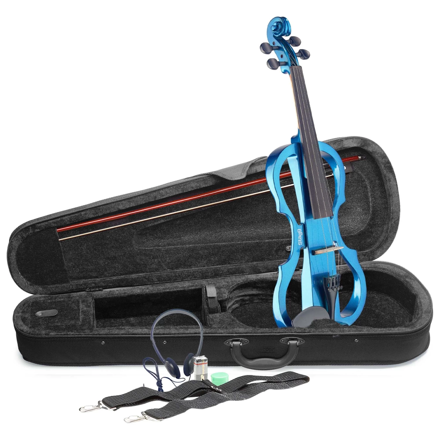 This striking electric violin is a popular choice with student musicians and experienced violinists looking to try something new and exciting! It comes in a complete outfit with moulded case and shoulder straps, headphones, rosin, bow and even a 9V battery so you can start playing right away.